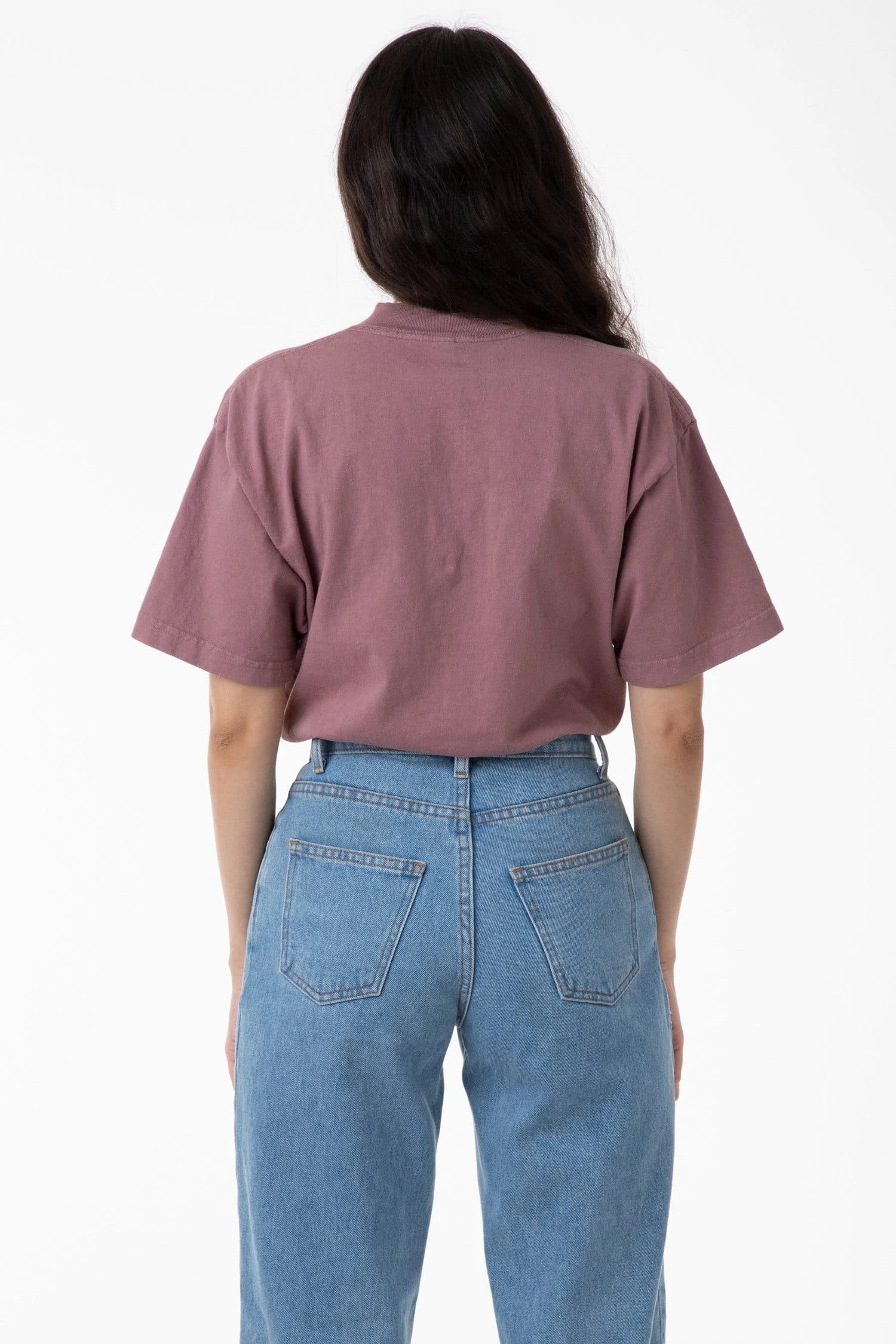 A heavier version of original garment dye tee with a mock neck for a more modern shape. Same loose, boxy fit with a higher neckline and beefier texture. This tee is part of our garment dye line, which is always custom dyed, shrink-free and sewn with 100% USA-grown cotton.