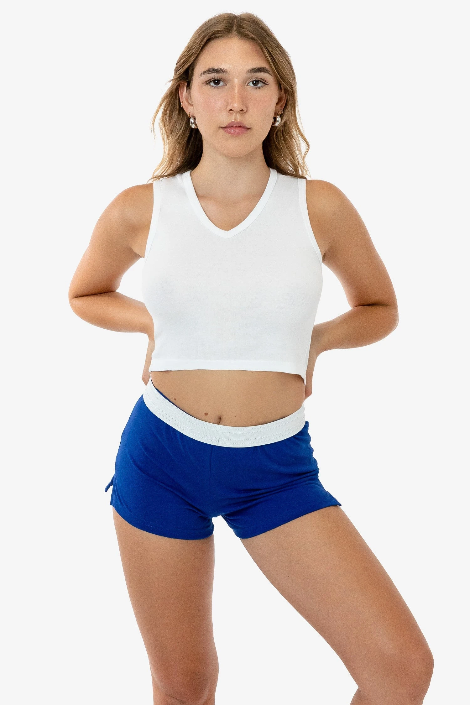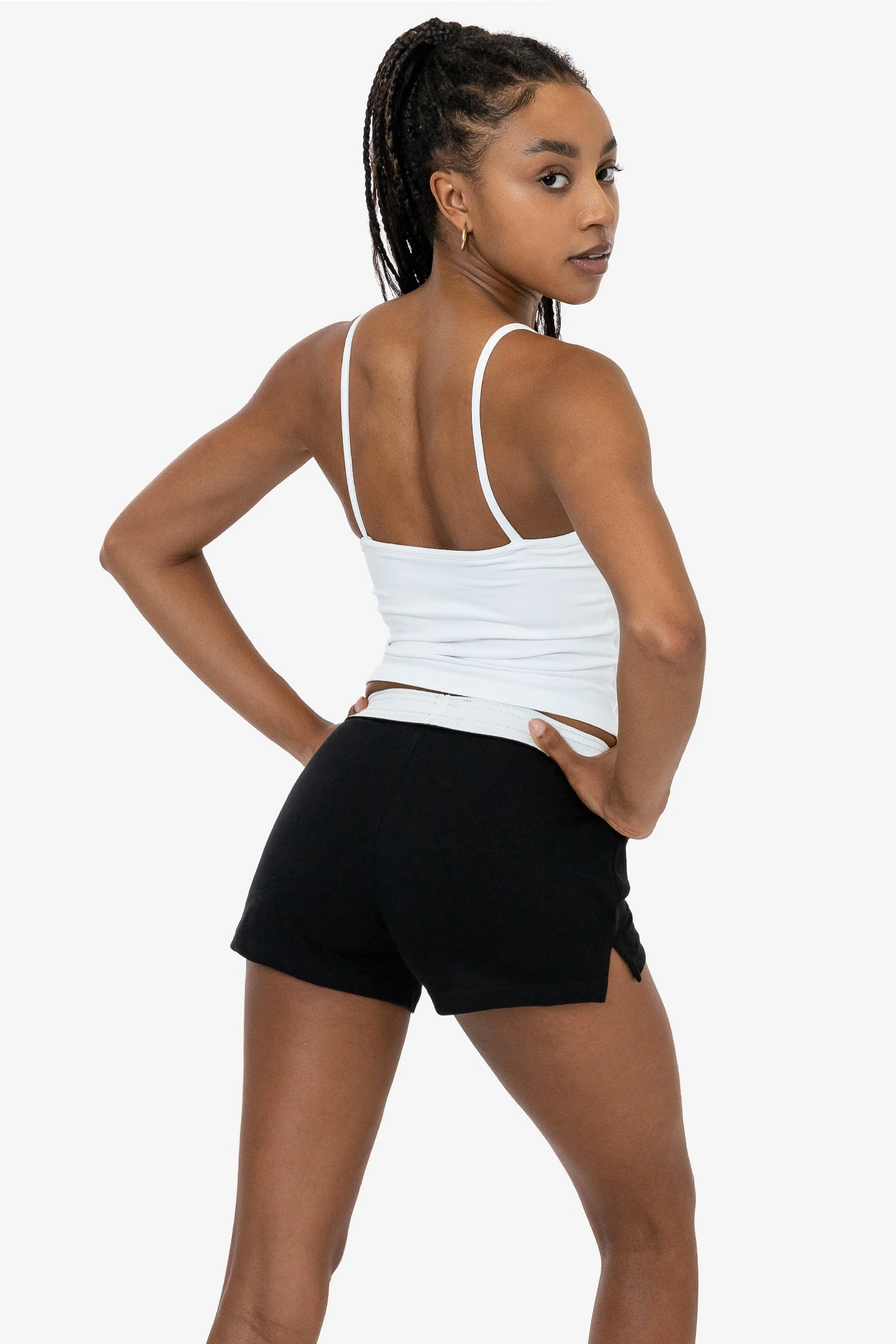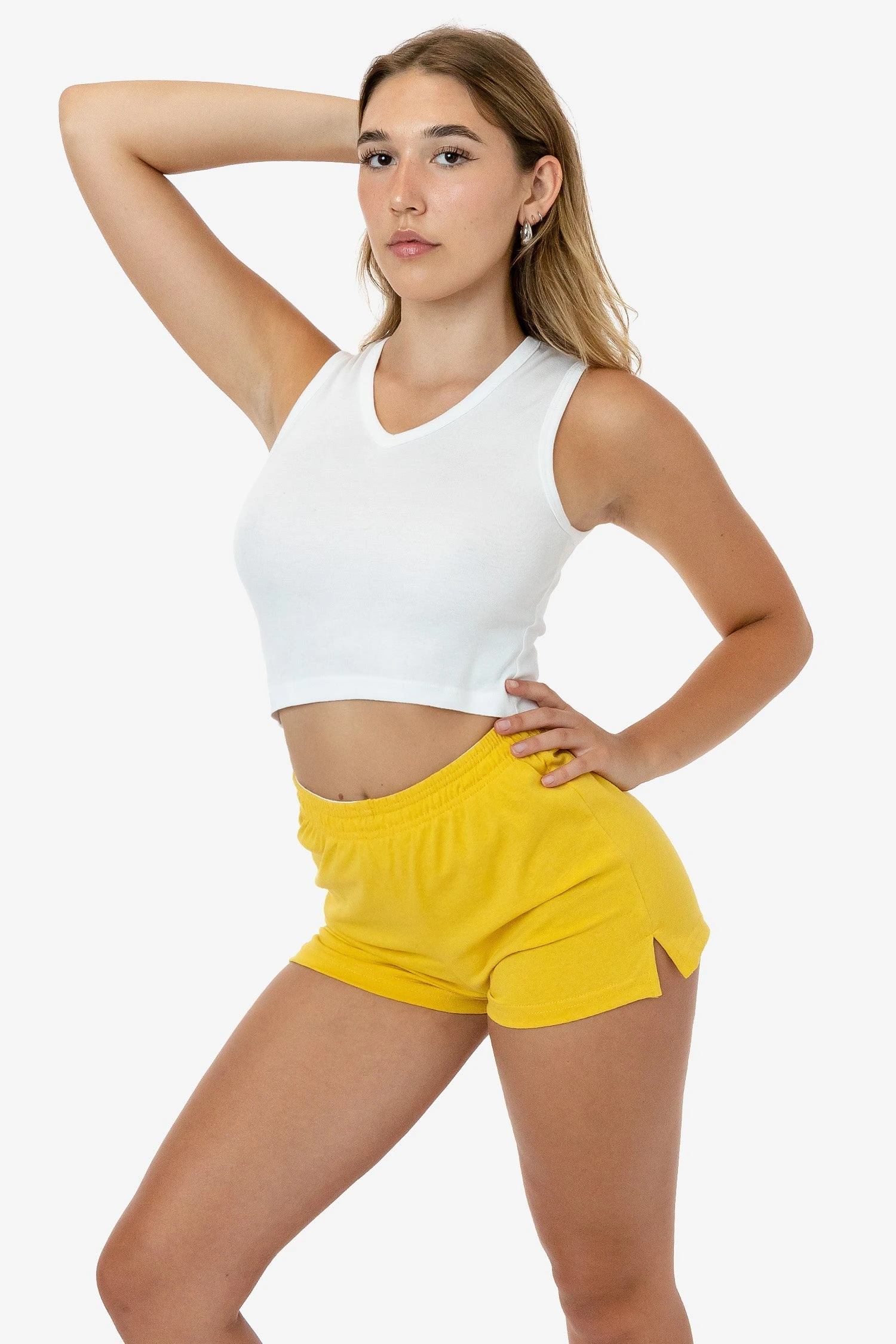 The ultimate casual short with a contrasting foldable elastic waistband. These cotton shorts are made of 6.5 oz. 100% cotton jersey for comfort and versatility and features 2 side vents for a sporty look. Pair with our cotton baby tees for effortless style and wear them high or low. Great for the gym, cheer practice, or lounging.