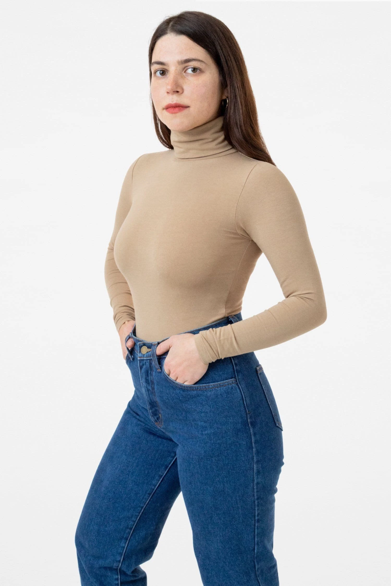 A tight, fitted turtleneck made of high quality cotton spandex with a full fold-over turtleneck to keep your neck warm in colder weather. This style has been improved with an updated sleeve fit that is fitted around the wrists. This top is ideal for layering without adding bulk underneath your favorite sweaters and jackets. This style runs small, we suggest sizing up.