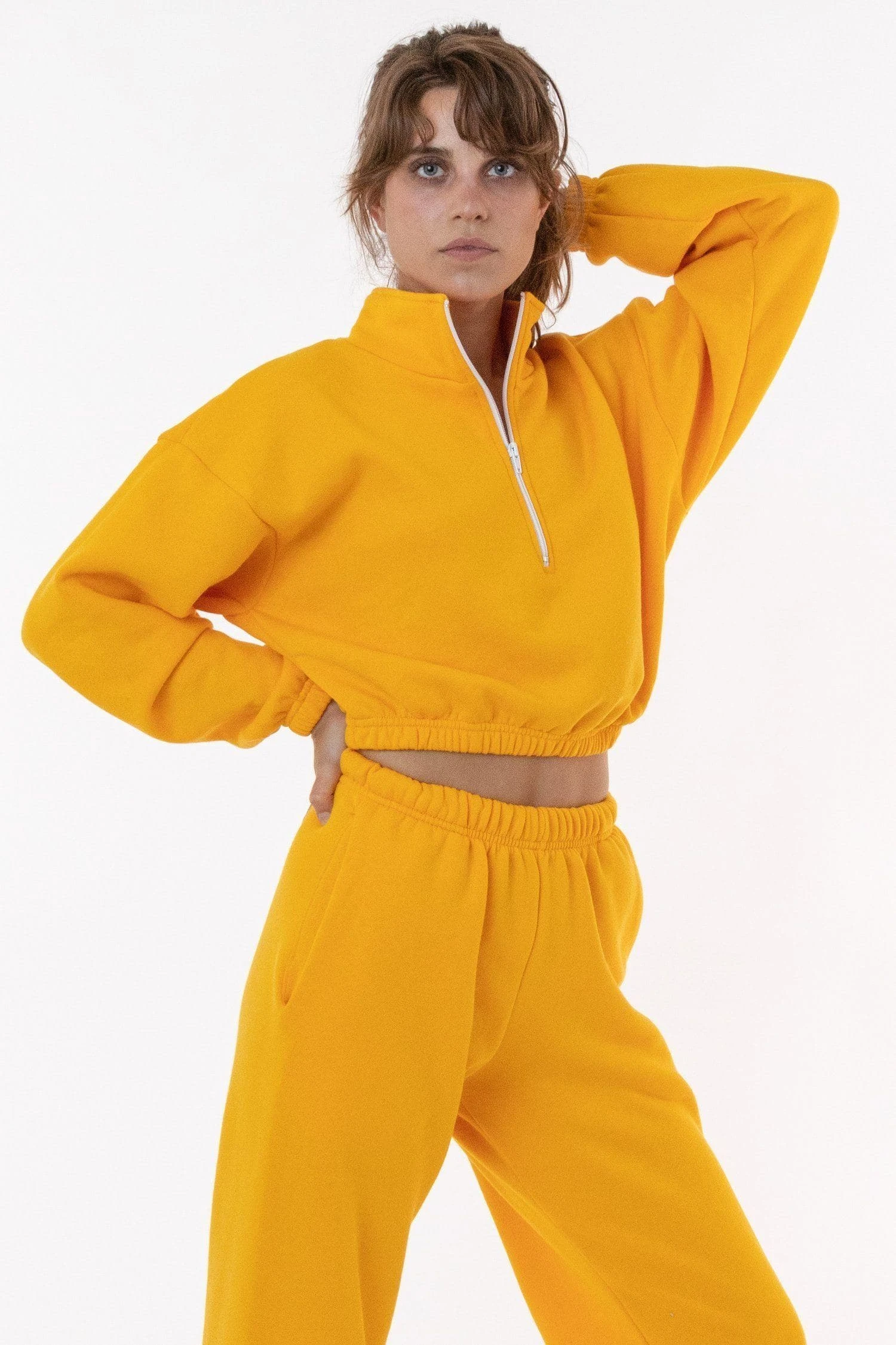 The Flex Fleece Half Zip Cropped Pullover. This pullover features elastic hems around the middle of the waist and at the wrists and this style can be worn zipped up or down. Casual and functional with a generous fit to the body and arms. Perfect for layering over our crop tops and bike shorts. This fleece is soft and comfortable.