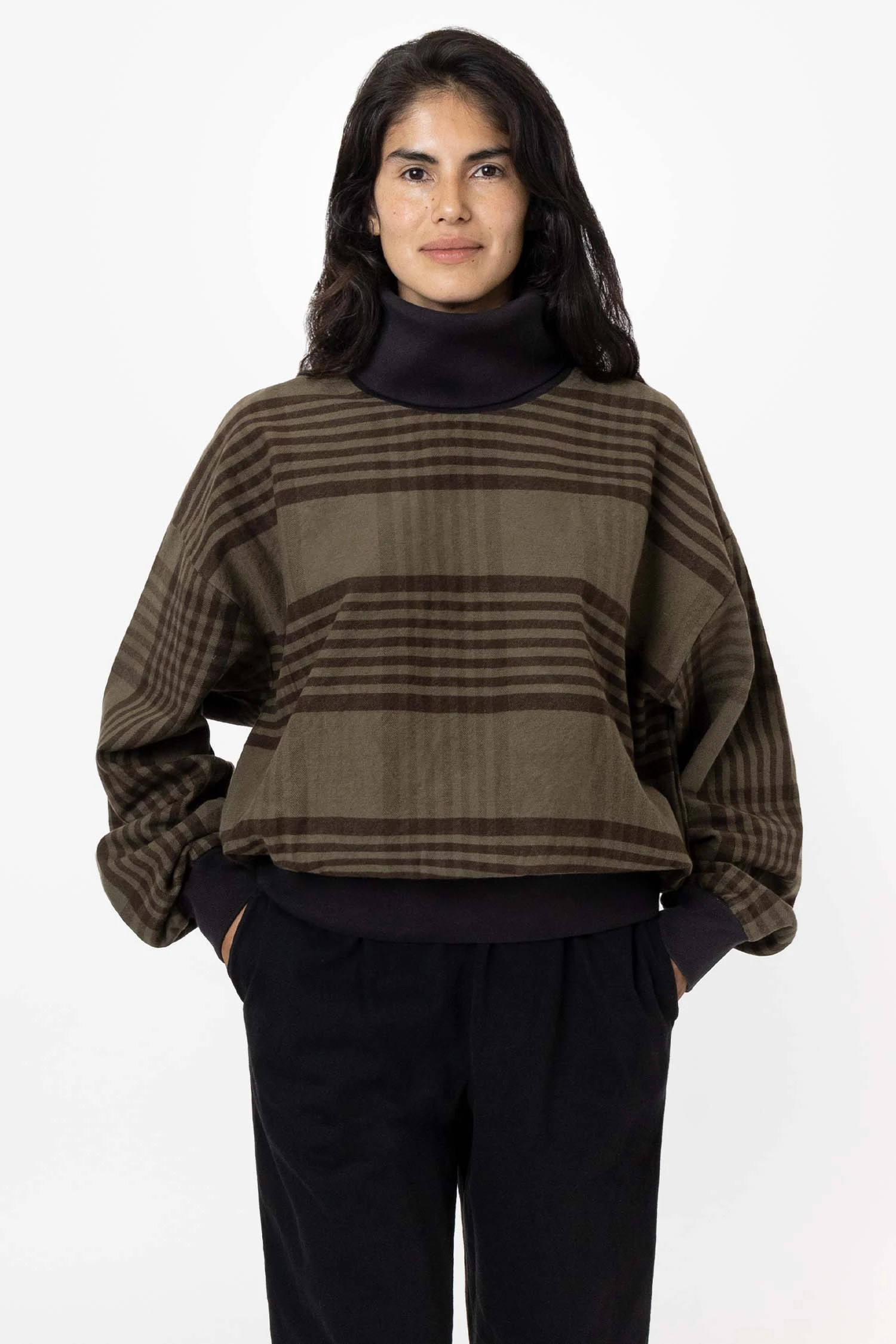 The Flannel Turtle Neck Sweater is made of 100% Cotton Flannel fabric and it has been enzyme wash for a soft feeling. This blouson piece is one size and meant to be worn oversized. Layer it with with your favorite RLW100 Wool Coat to keep you warm and cozy.
