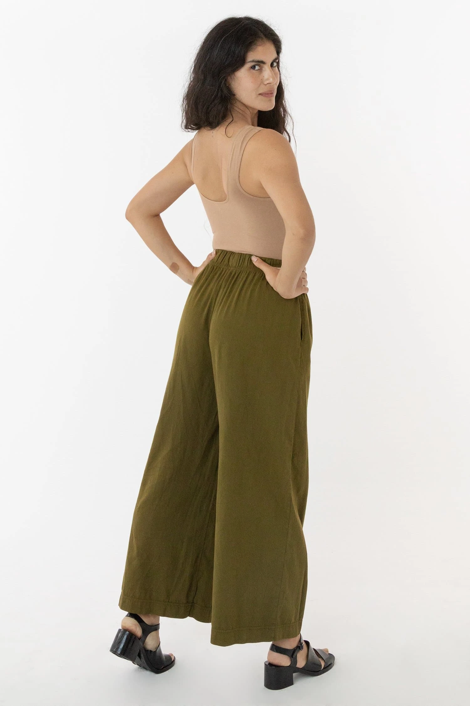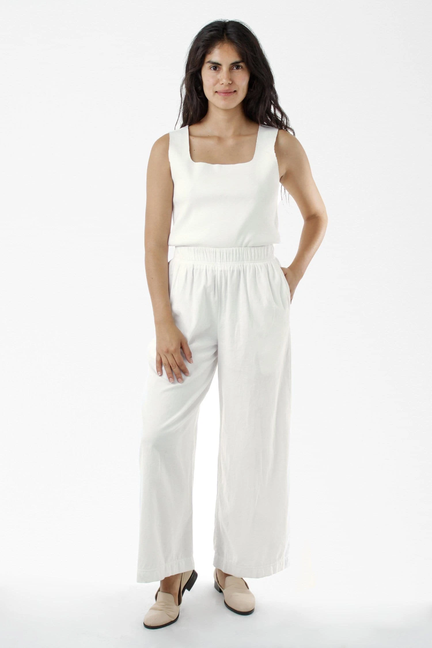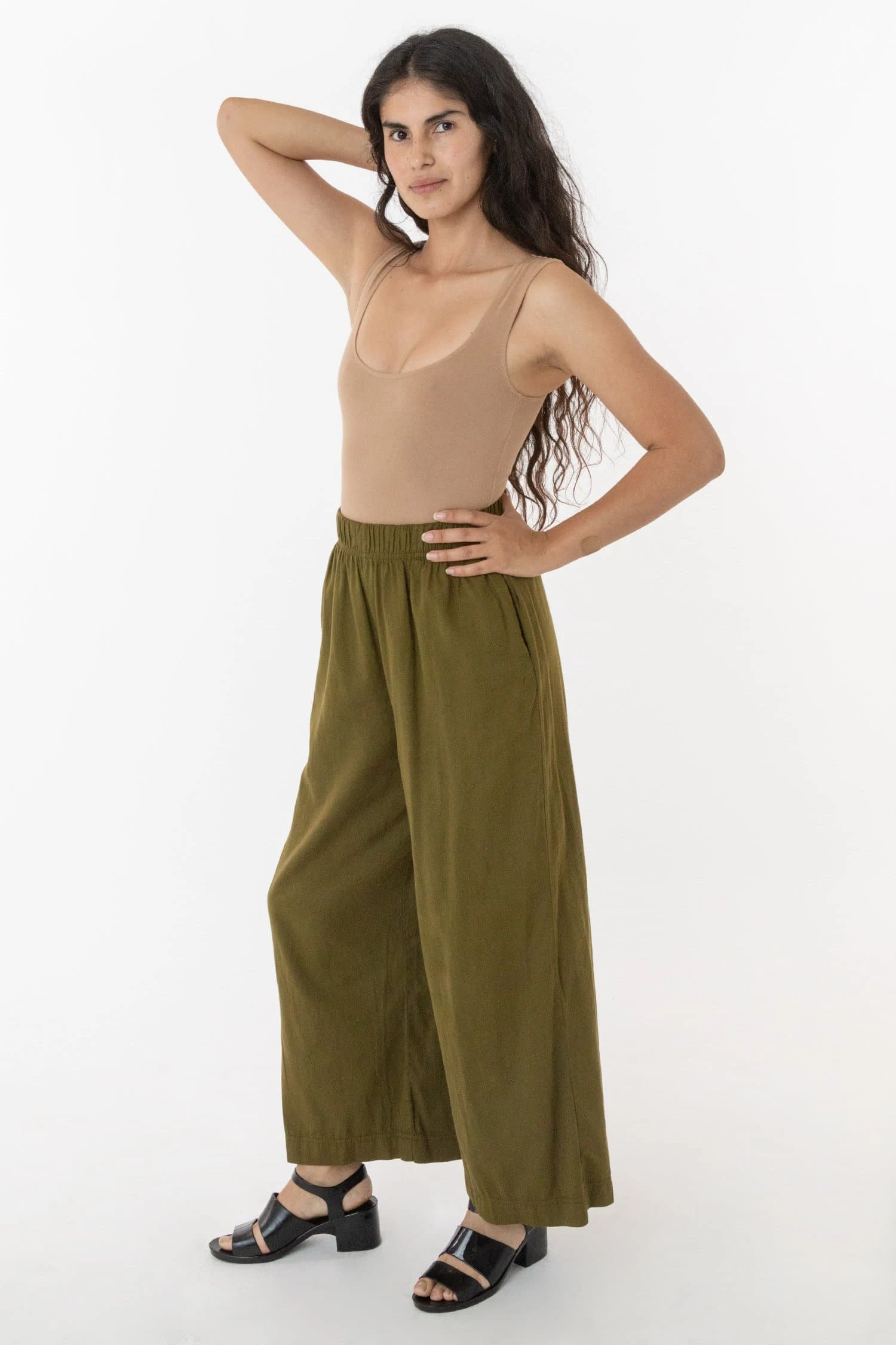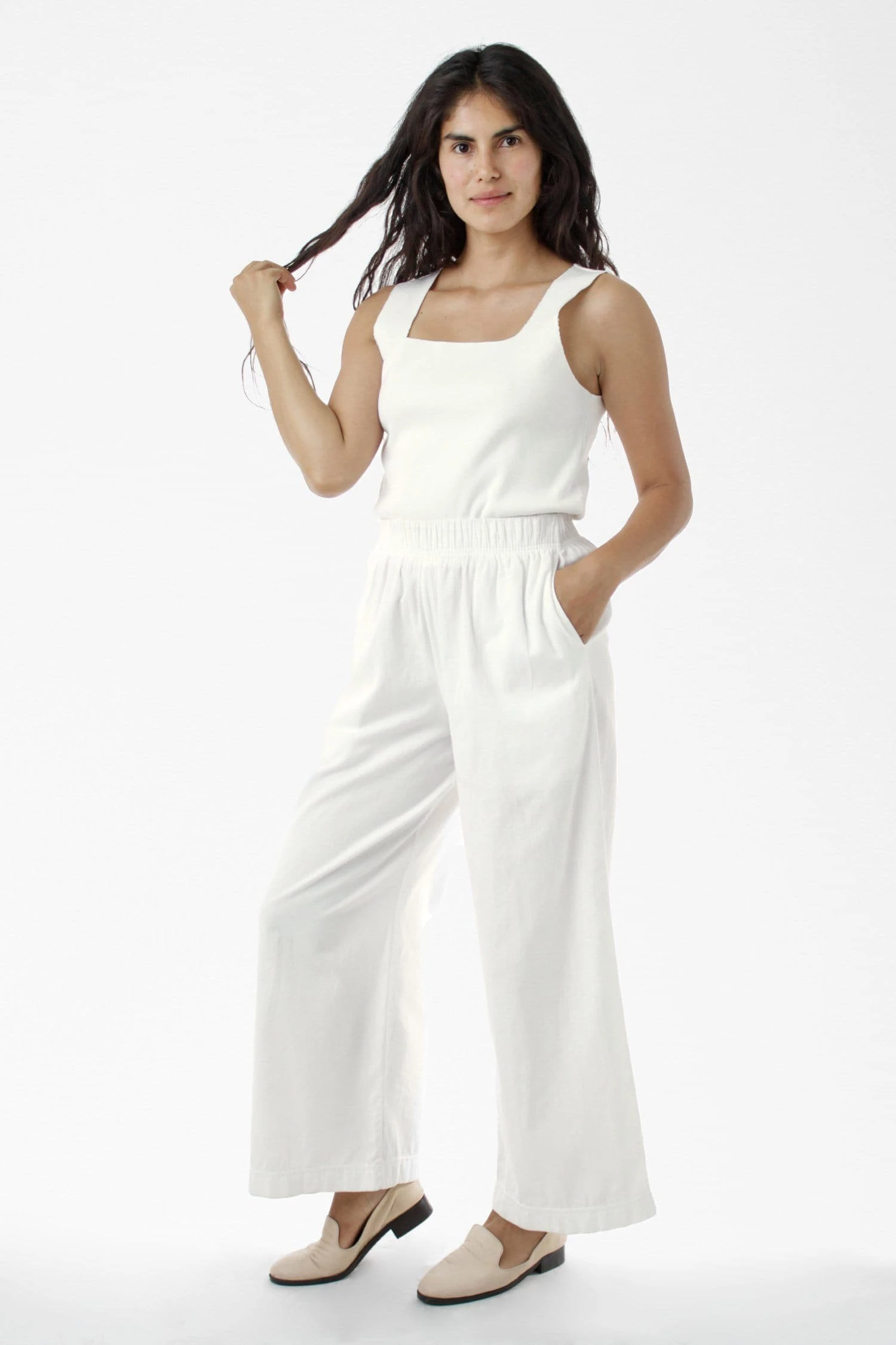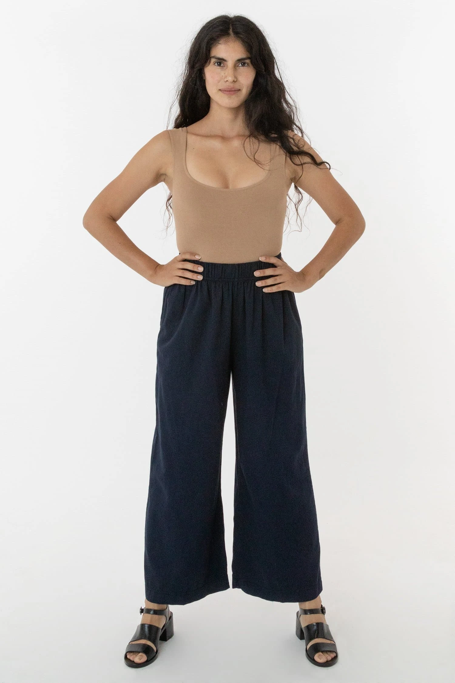 This relaxed cotton twill pant features a breezy wide leg fit and a 2 inch soft elastic waist for everyday comfort. This style can be worn for an everyday vacation look with our cotton spandex bodysuit styles or dressed up with a sweater or blouse. Comes with two side pockets.