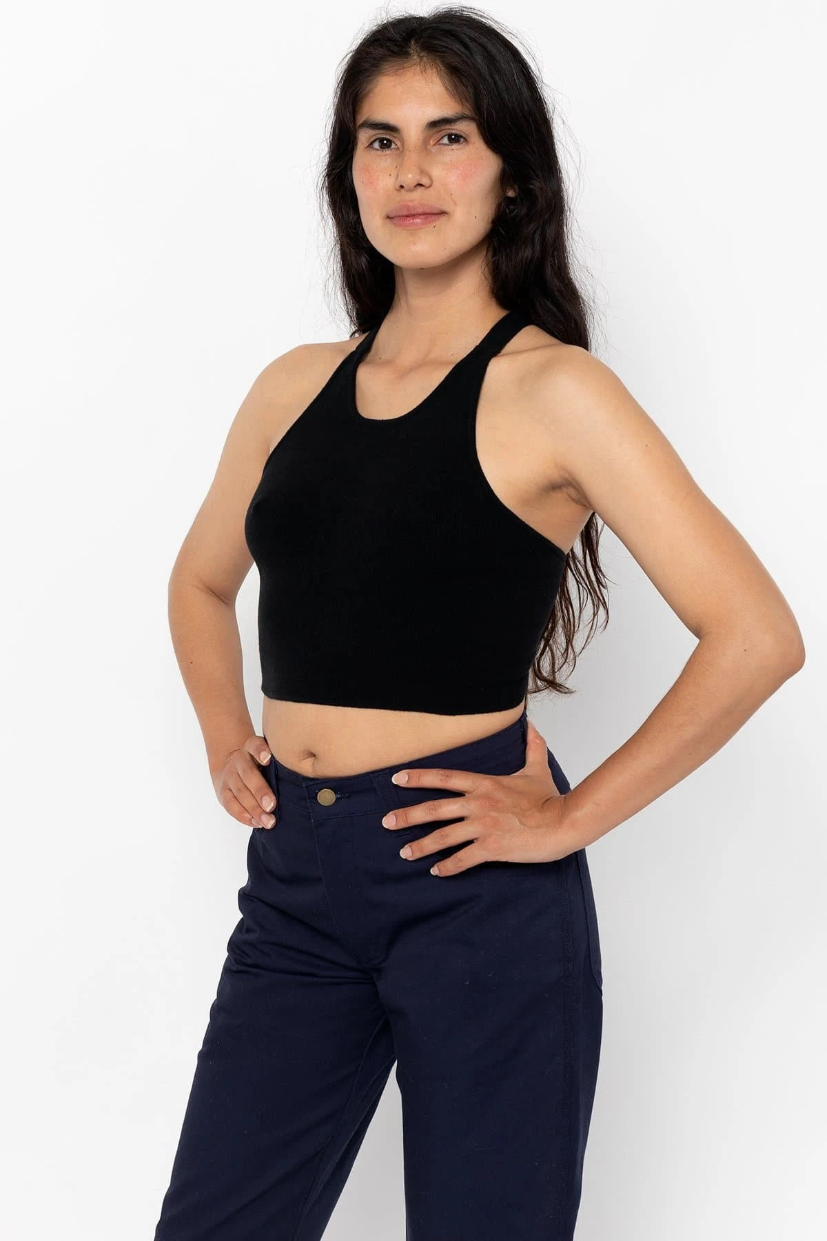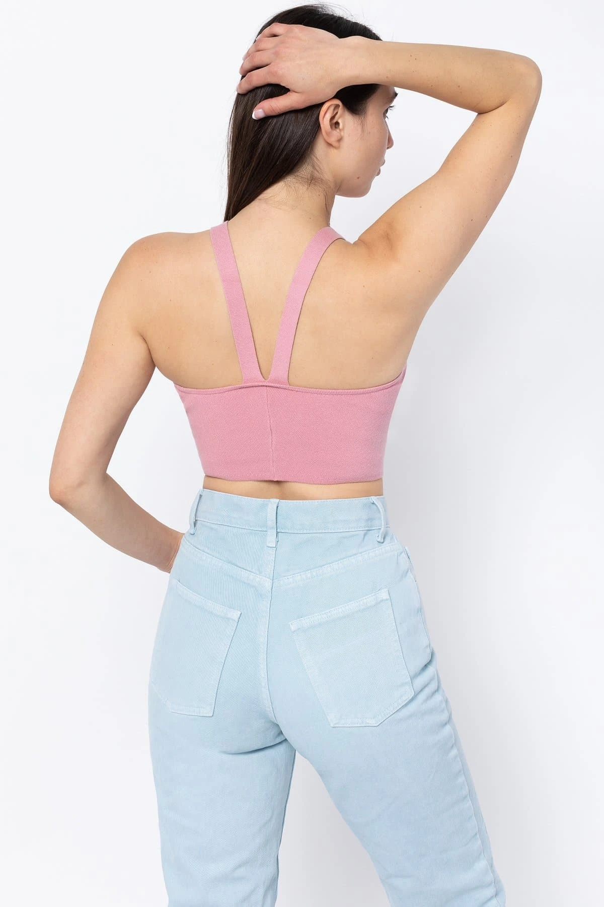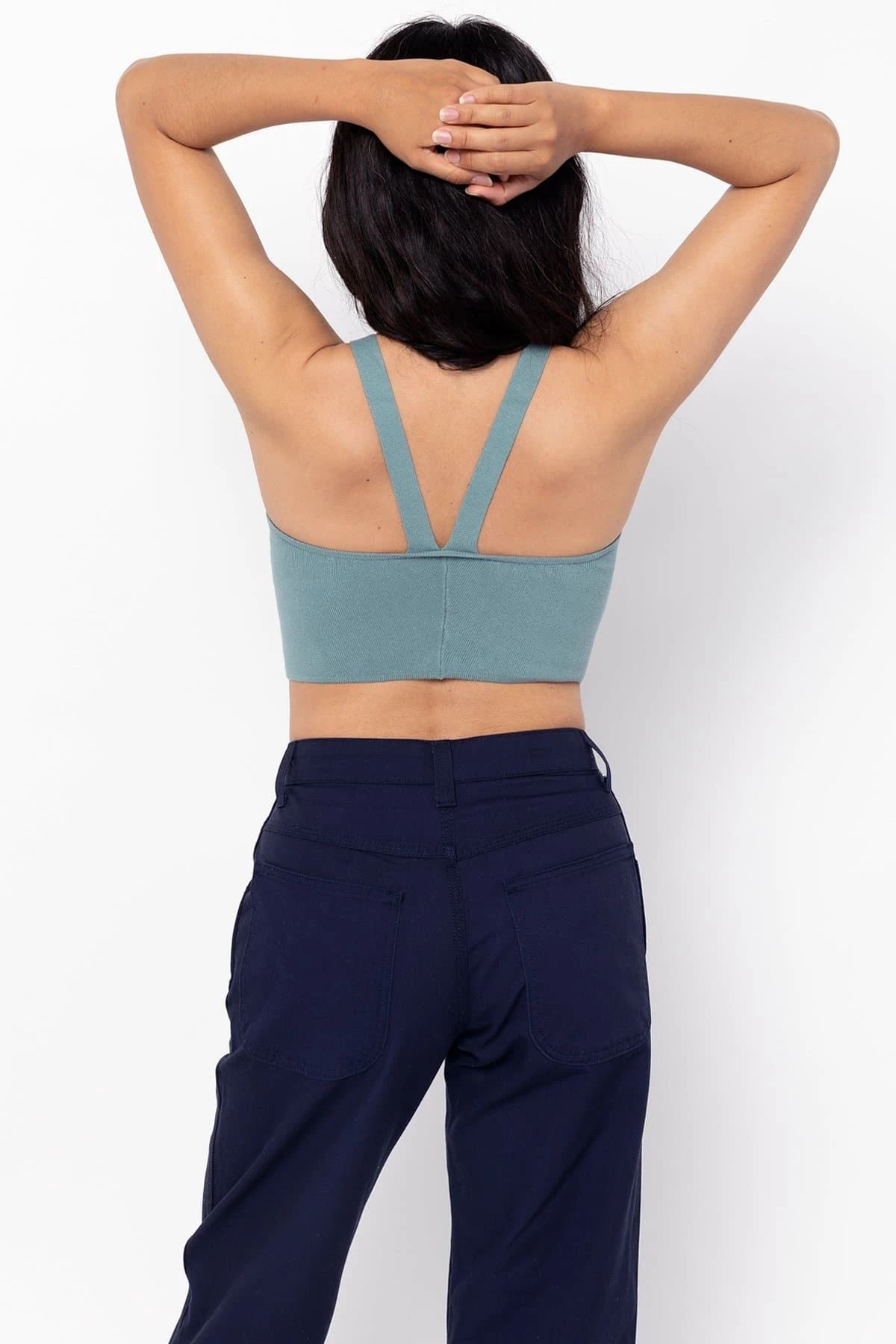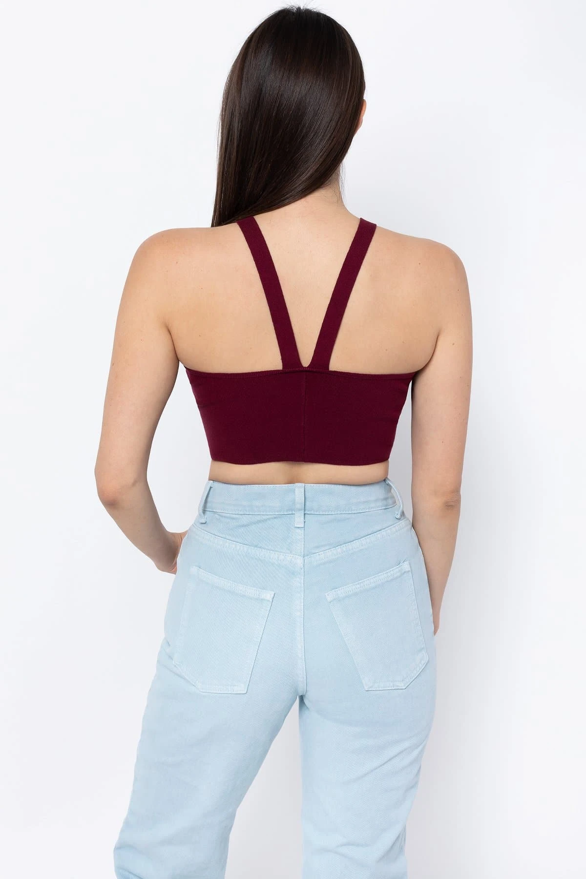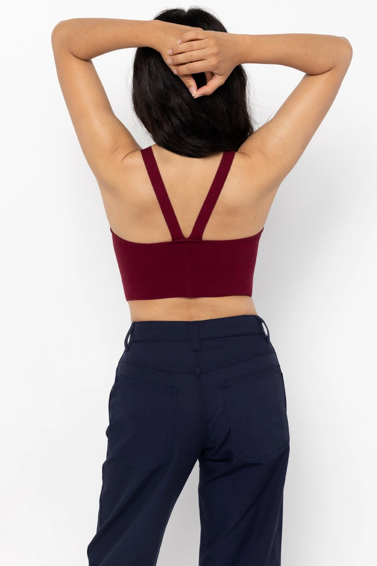 The V Strap Knit Top is knit with a thick cotton yarn in a miniature ribbed pattern. It’s insanely comfortable, with a thicker feel and dressier look than our regular cotton spandex fabric.