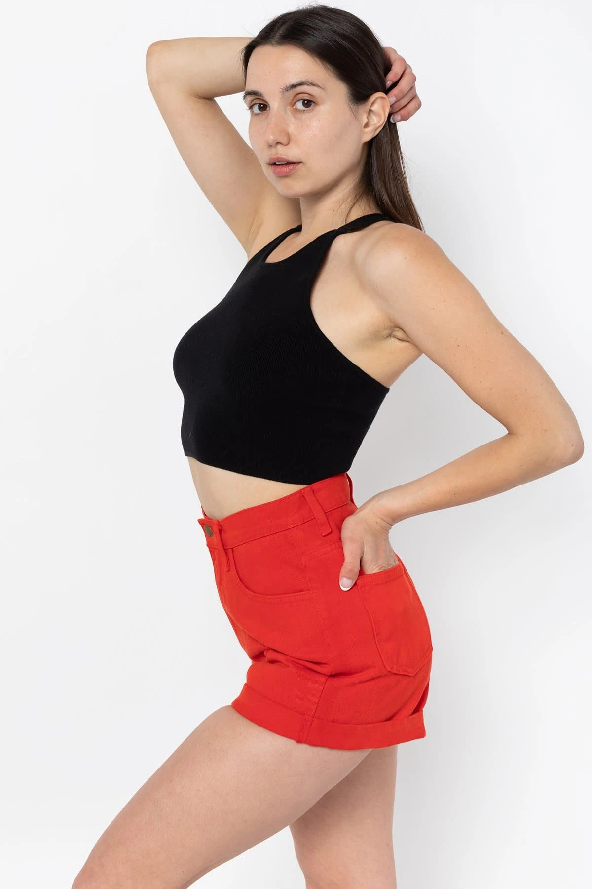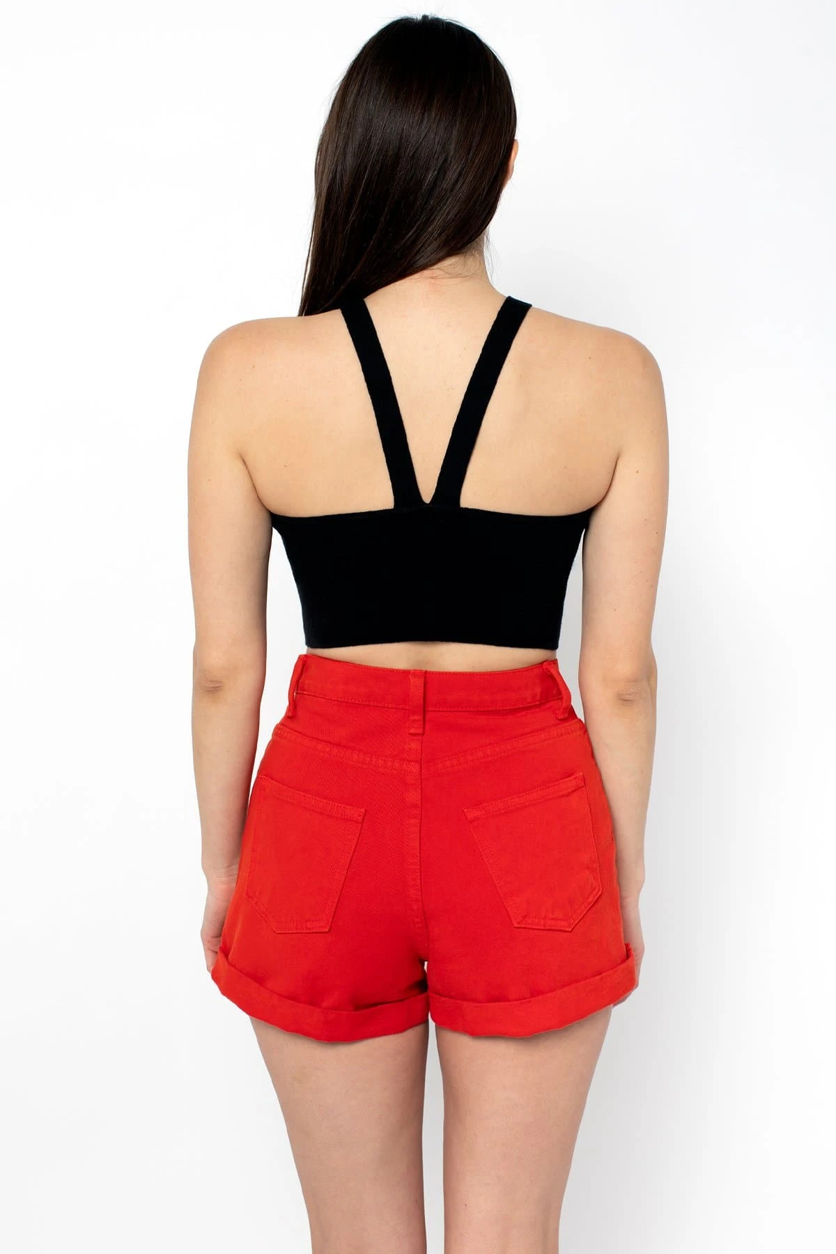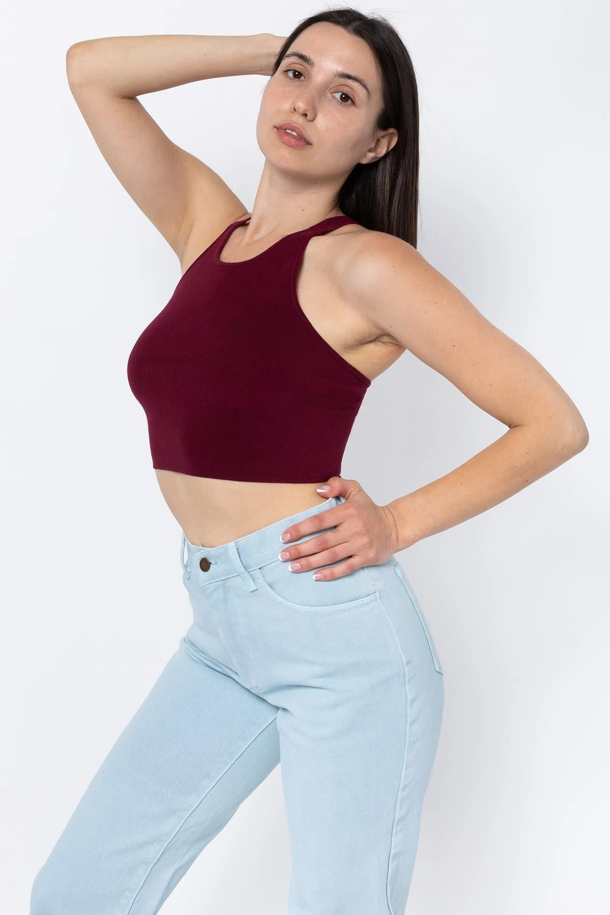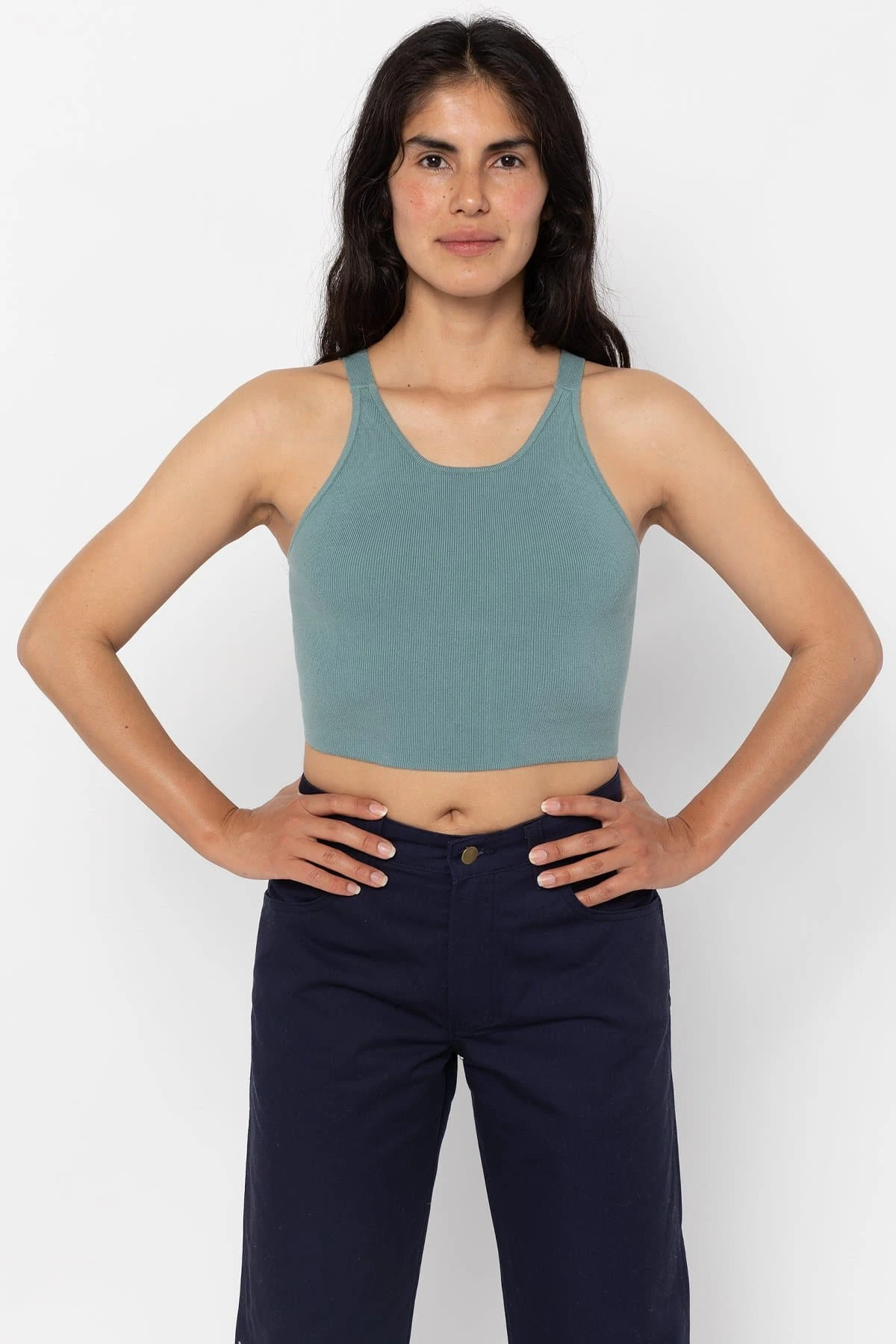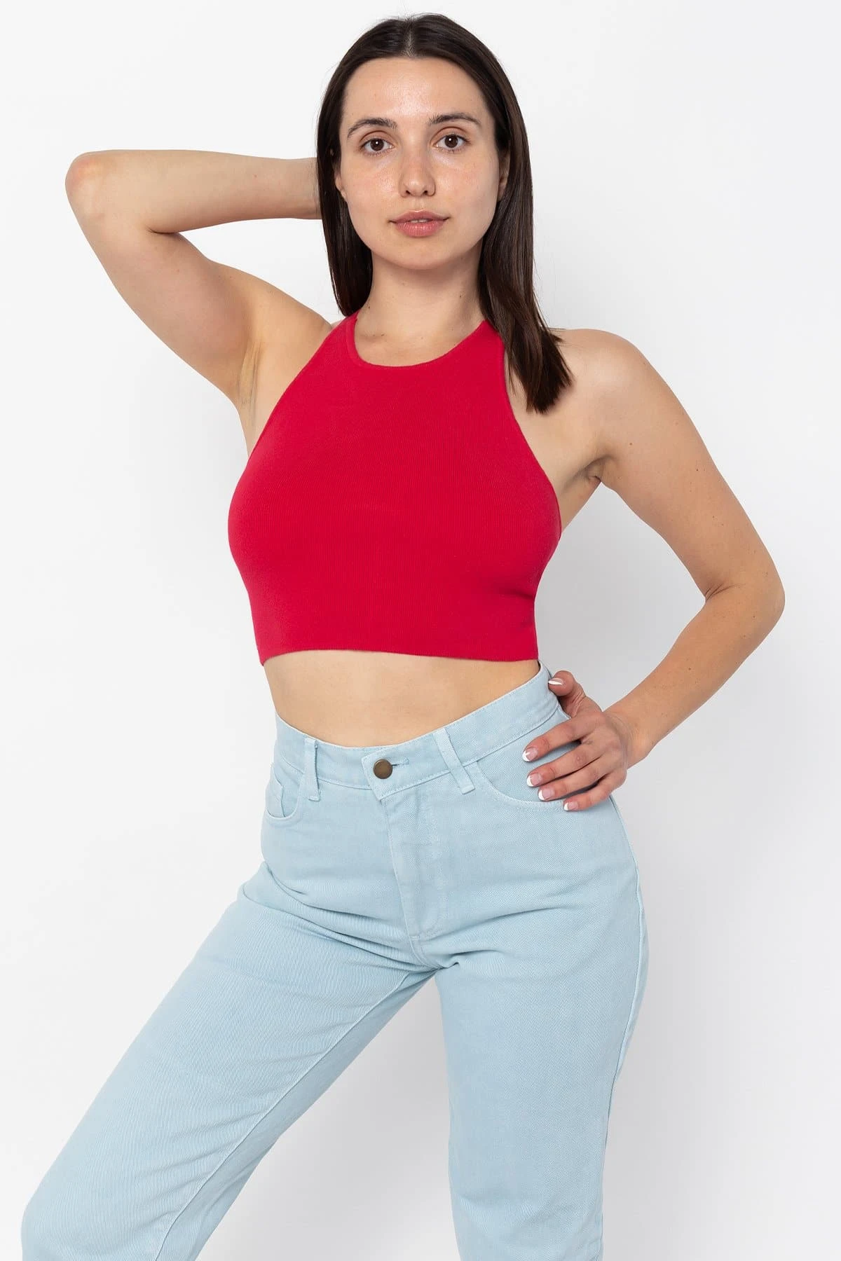 The V Strap Knit Top is knit with a thick cotton yarn in a miniature ribbed pattern. It’s insanely comfortable, with a thicker feel and dressier look than our regular cotton spandex fabric.