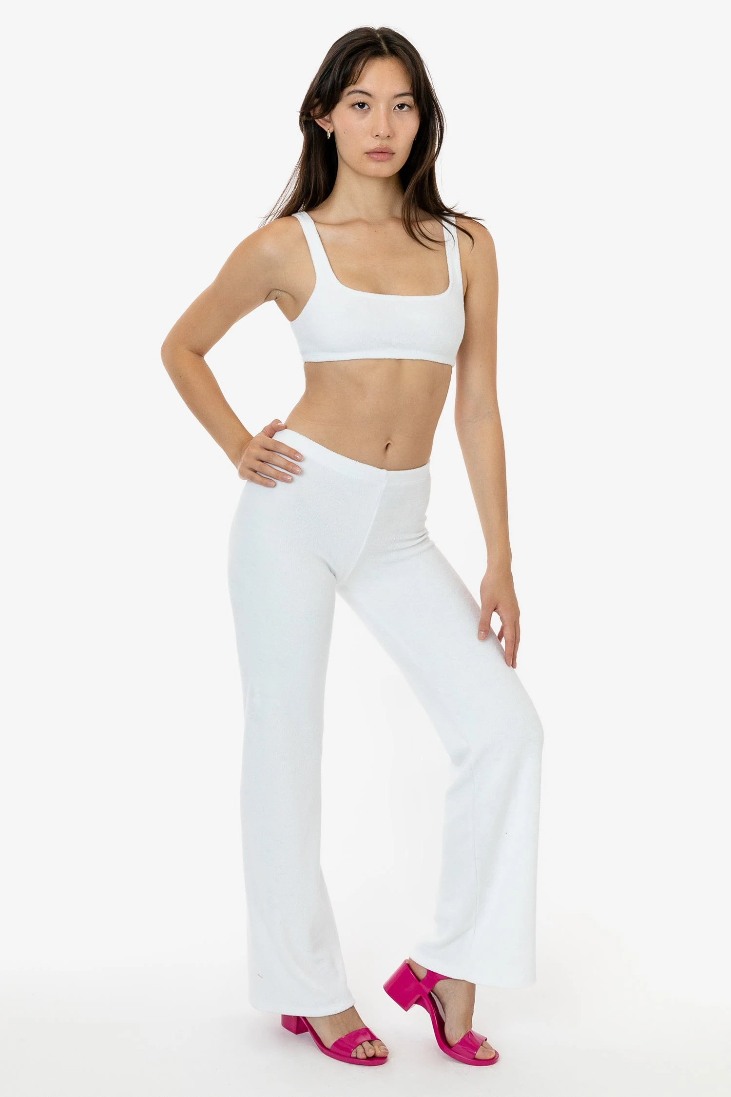 These versatile loop terry pants will elevate your loungewear or make the perfect layering piece after the beach. They feature a low to mid-rise fit and flared leg for a dressier look when desired. Pair with one of our bodysuits or matching loop terry tops for a fun dinner outfit or one of our matching baby tees for a more casual approach. Our loop terry has a subtle, natural stretch and a stretchy elastic waistband make for a comfortable fit for any occasion.