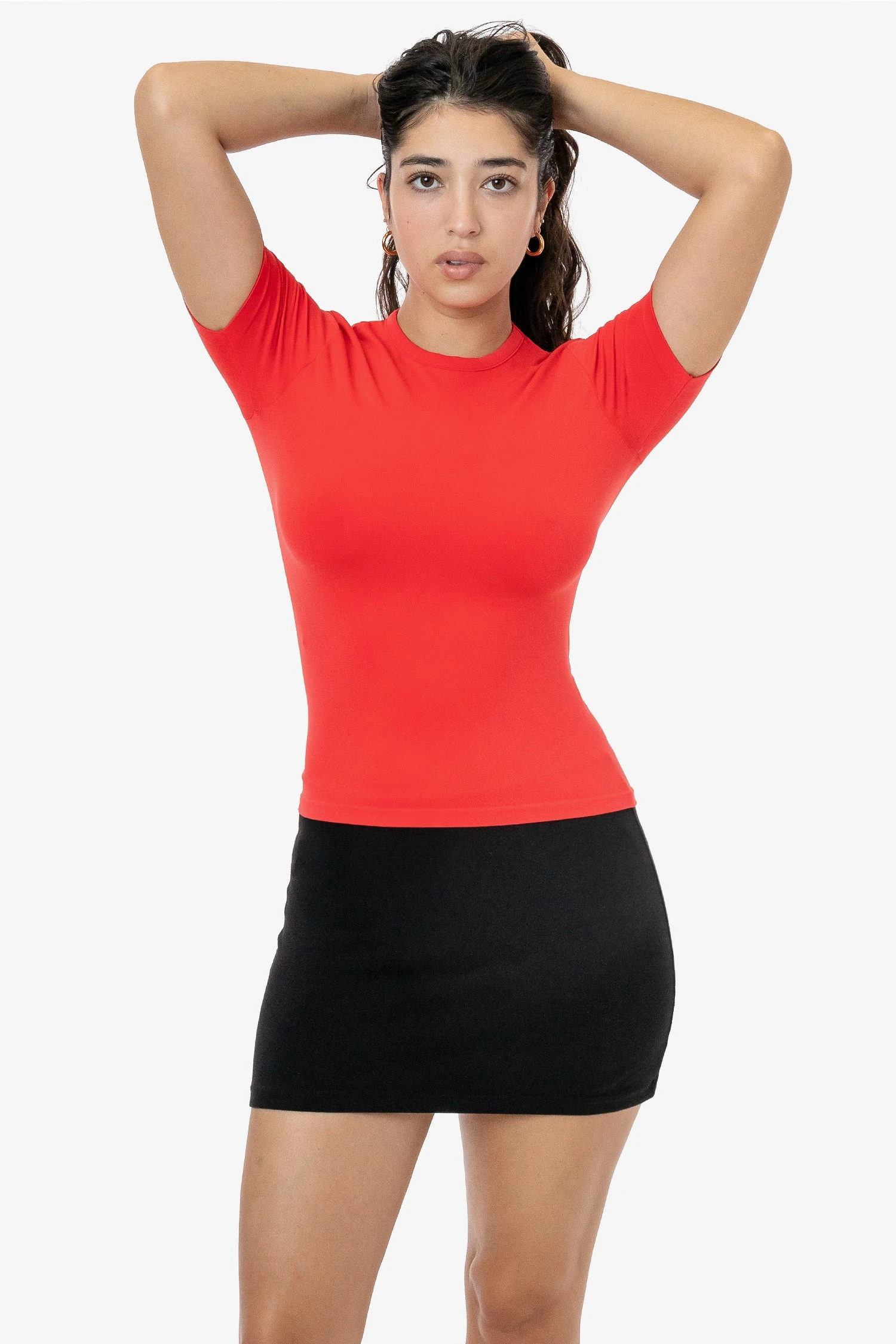 This seamless nylon/spandex baby tee features a mid-length fit, high crew neckline and short sleeves. An everyday sportswear-inspired basic with a super smooth finish and generous stretch for extreme comfort. Try layering this piece with oversized sweatpants and a matching zip up hoodie.