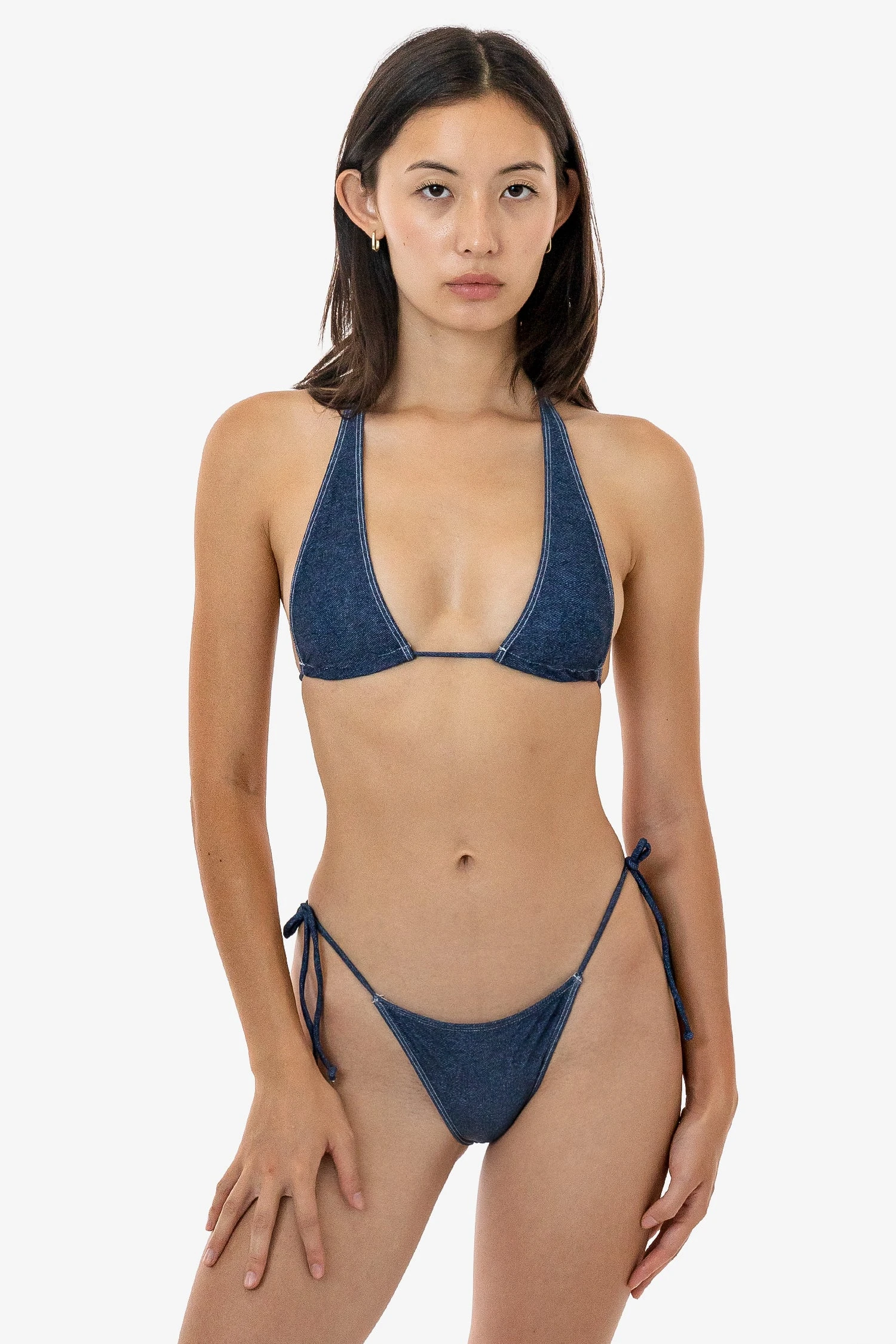 An iconic bikini bottom with spaghetti ties at the sides for an adjustable fit. This bikini bottom has a higher rise than similar styles and a more narrow appearance. We like this style tied above the hips for a 90s inspired look. Try these bottoms with our RNT3003P Printed String Bikini Top or mix and match with our other swim styles. Fully lined and made in the USA by workers earning fair wages.