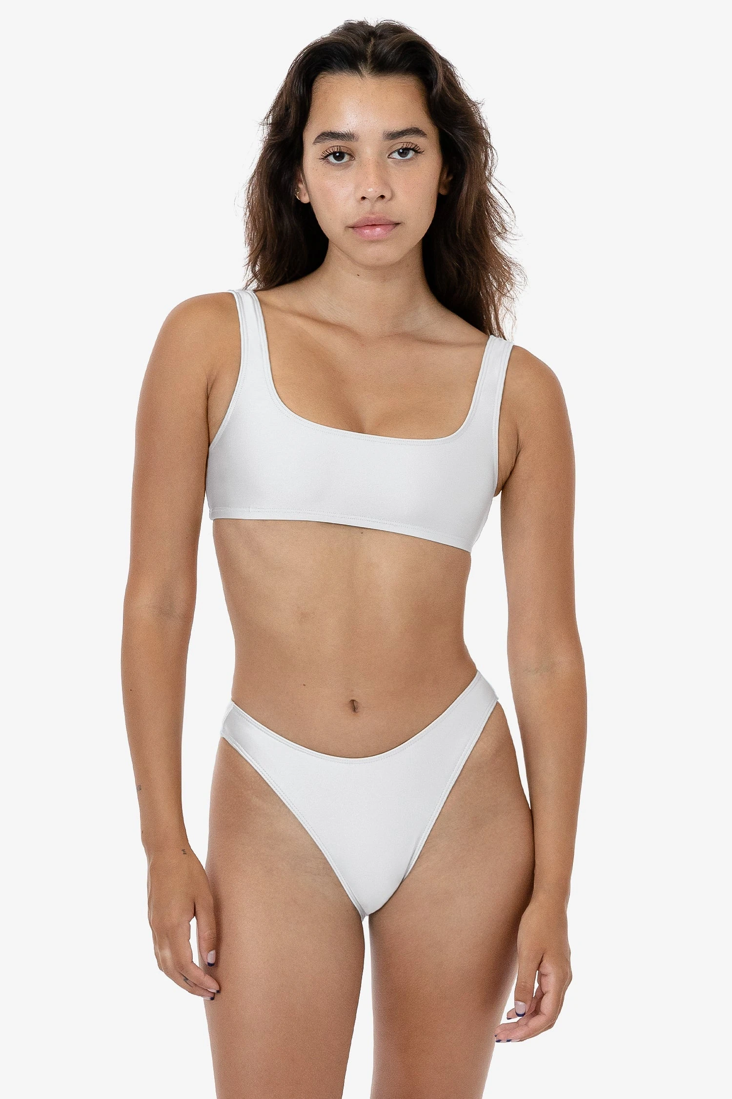 This sporty, vintage-inspired swimsuit bottom features a high-rise fit with a curved waistline that accentuates your figure. The high cut leg openings show off your legs and balance out the full-coverage back. Unlike cheeky bottoms which tend to ride up when you move around in them, this style has a lower seat to keep it in place all day long. This style is ideal if you have a larger bottom and runs true to size. Mix and match this fully lined bikini bottom with our matching RNT3005 Square Neck Bikini Top.