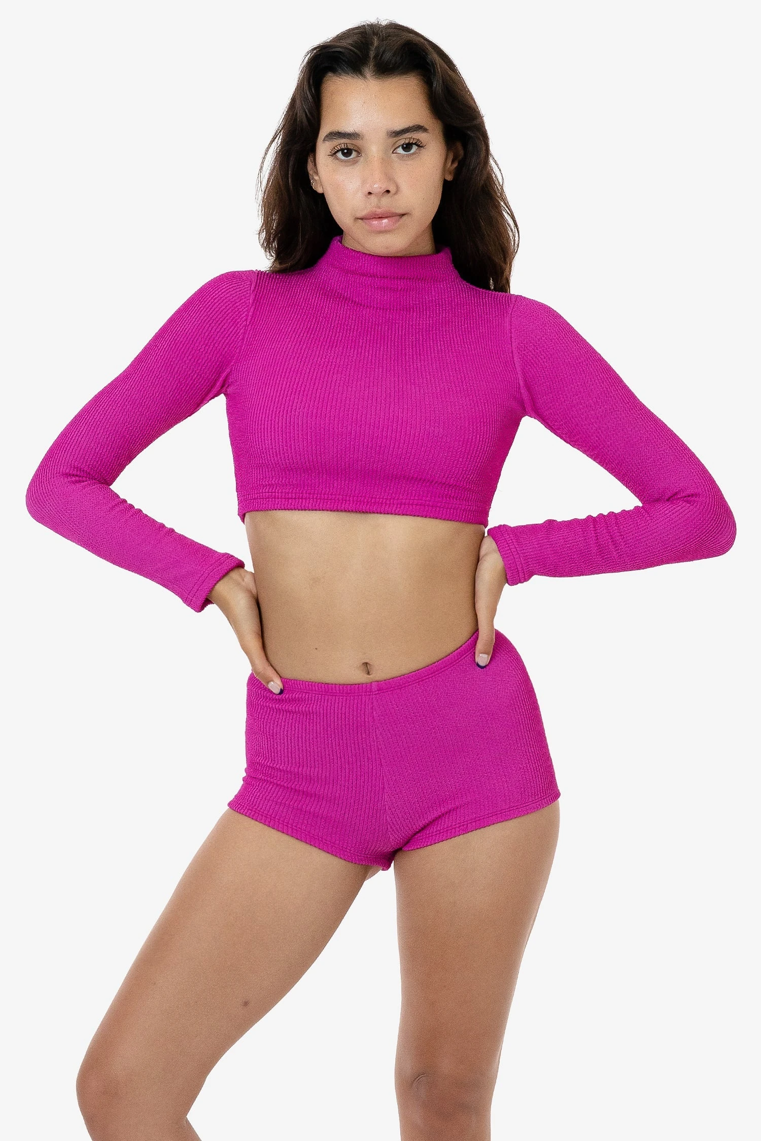 Our crinkle swimwear collection is made of a super stretchy, playfully textured fabric that conforms to fit your body. This statement-making top can be worn on windy days at the beach or with your desired bottoms for everyday wear– like our tennis skirt, jeans or denim shorts. This style features a seamless mockneck, long sleeves and a cropped fit that pairs well with the matching RPC3030 Crinkle Hot Shorts or RPC3009 Crinkle High Cut Bikini Bottom. This style is unlined due to the nature of the fabric, but is suitable for use in water.