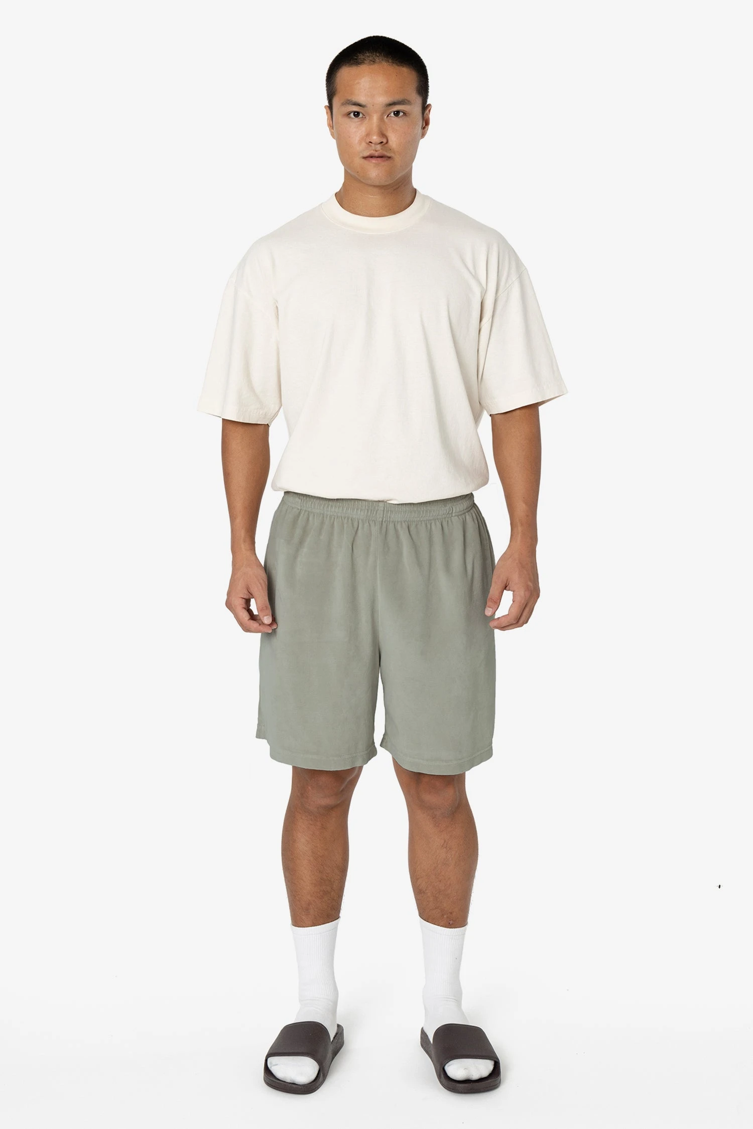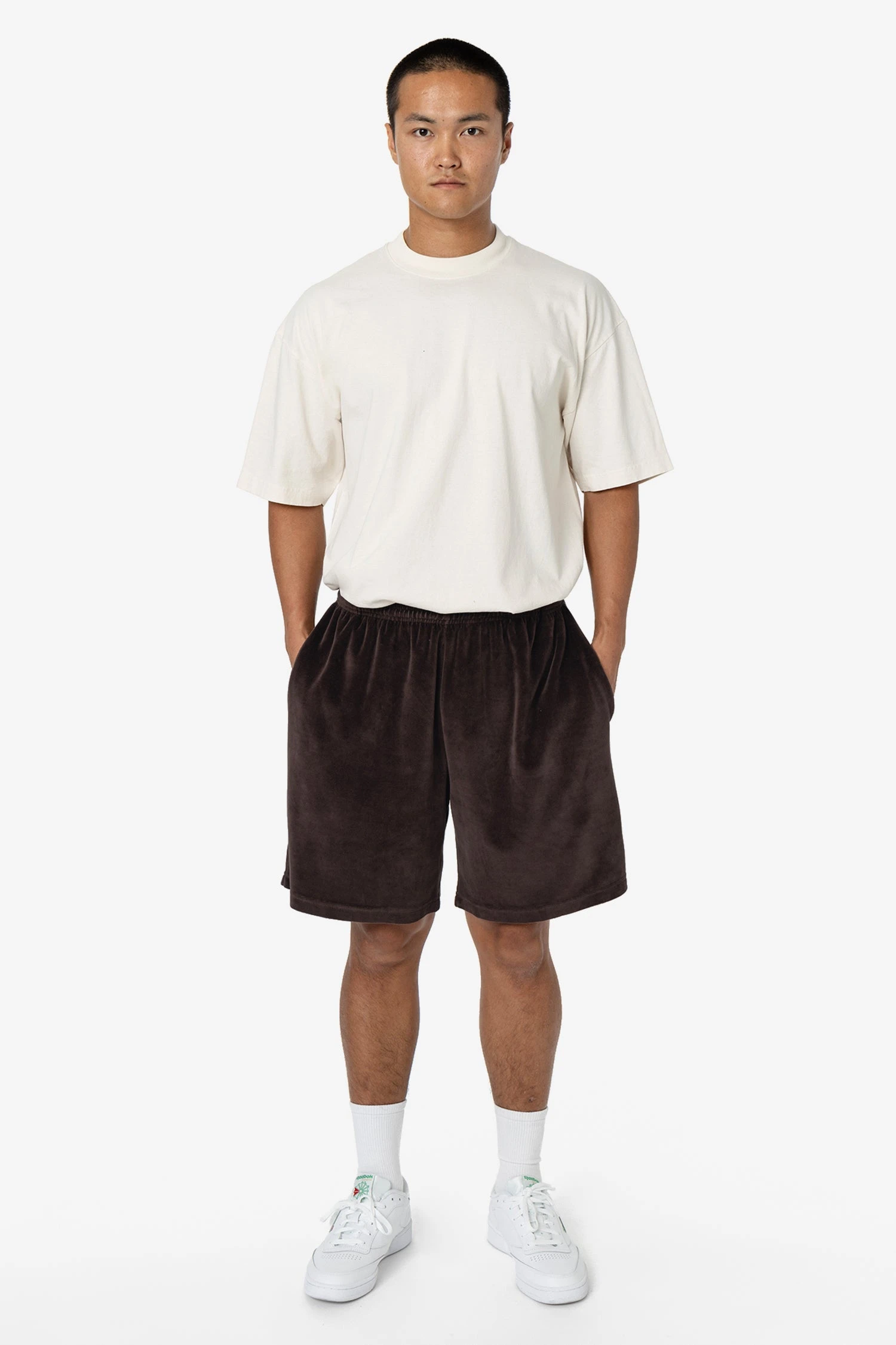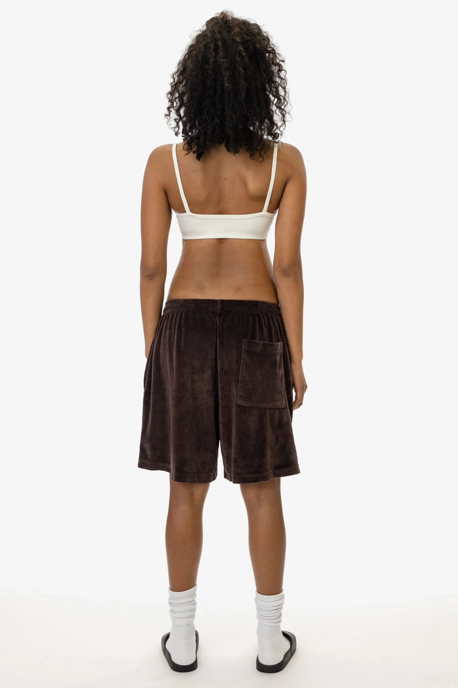 Our velour mid-length shorts have a roomy, wide leg and a unisex fit. These shorts have 2 side pockets, one back pocket and an adjustable drawcord inside the elastic waistband. Runs true to size. Women may wish to size down.
