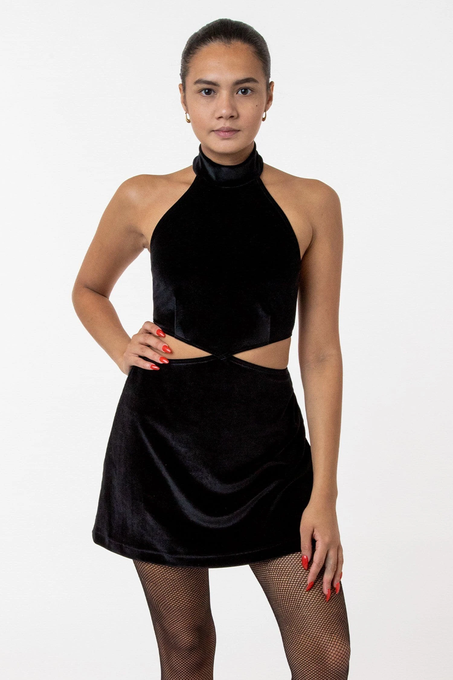 This velvet cocktail dress combines all of our favorite things. It features a halter neckline that flatters the arms and back, a mock neck collar with matching pearlescent buttons, has an a-line skirt with a subtle v-shape in the back. This style is flirty, feminine and sexy all in one. Made of our stretch velvet that shines through the nigh with statement-making diamond cutouts on the sides. Pair with our hosiery styles to complete the look.